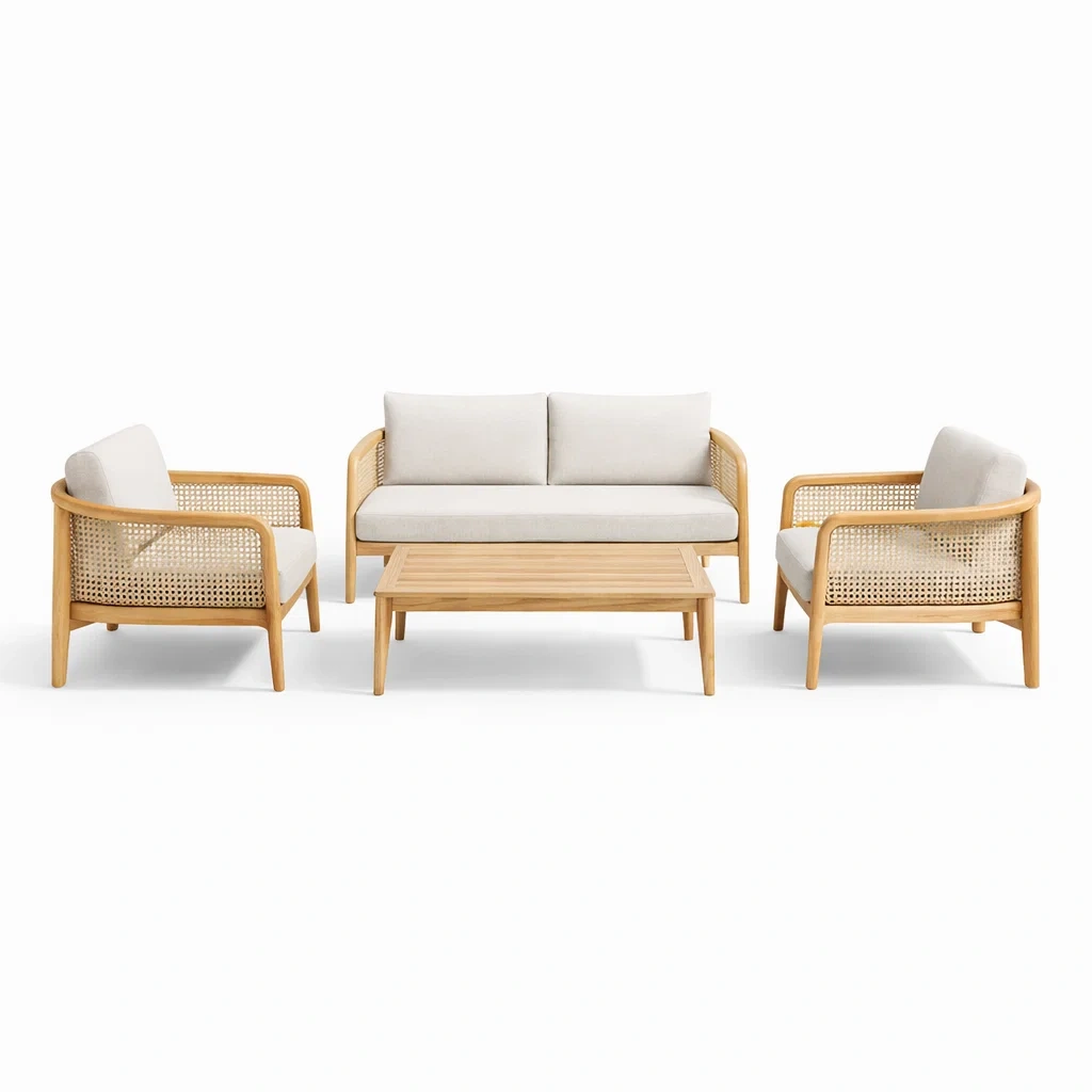 - 1 divano a due posti in legno di teak e rattan, dimensioni 160 cm x 75 cm x 80 cm e peso 25 kg.