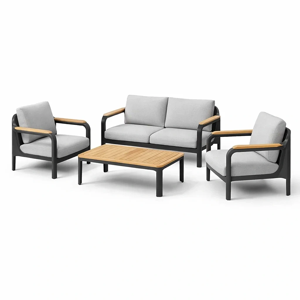 Materiale: Struttura in alluminio, braccioli e piano tavolino in legno teak, cuscini in tessuto poliestere.